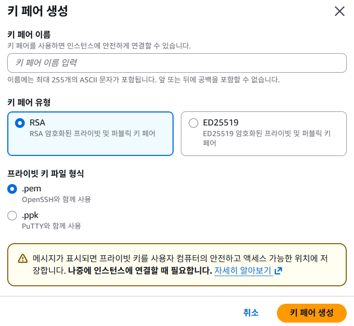 저는 master1로 이름짓고, RSA와 .pem 형식으로 설정했습니다.