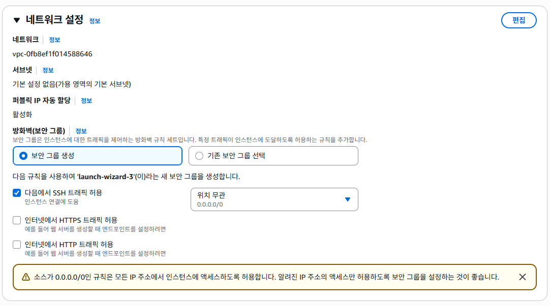- 활성화 = 인스턴스 시작 시 외부에서 접근 가능한 공인 IP를 자동으로 부여
