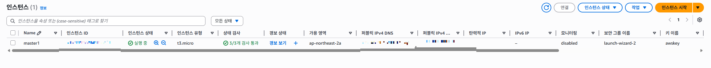그럼 인스턴스 창에 이렇게 한 줄 생성됩니다.