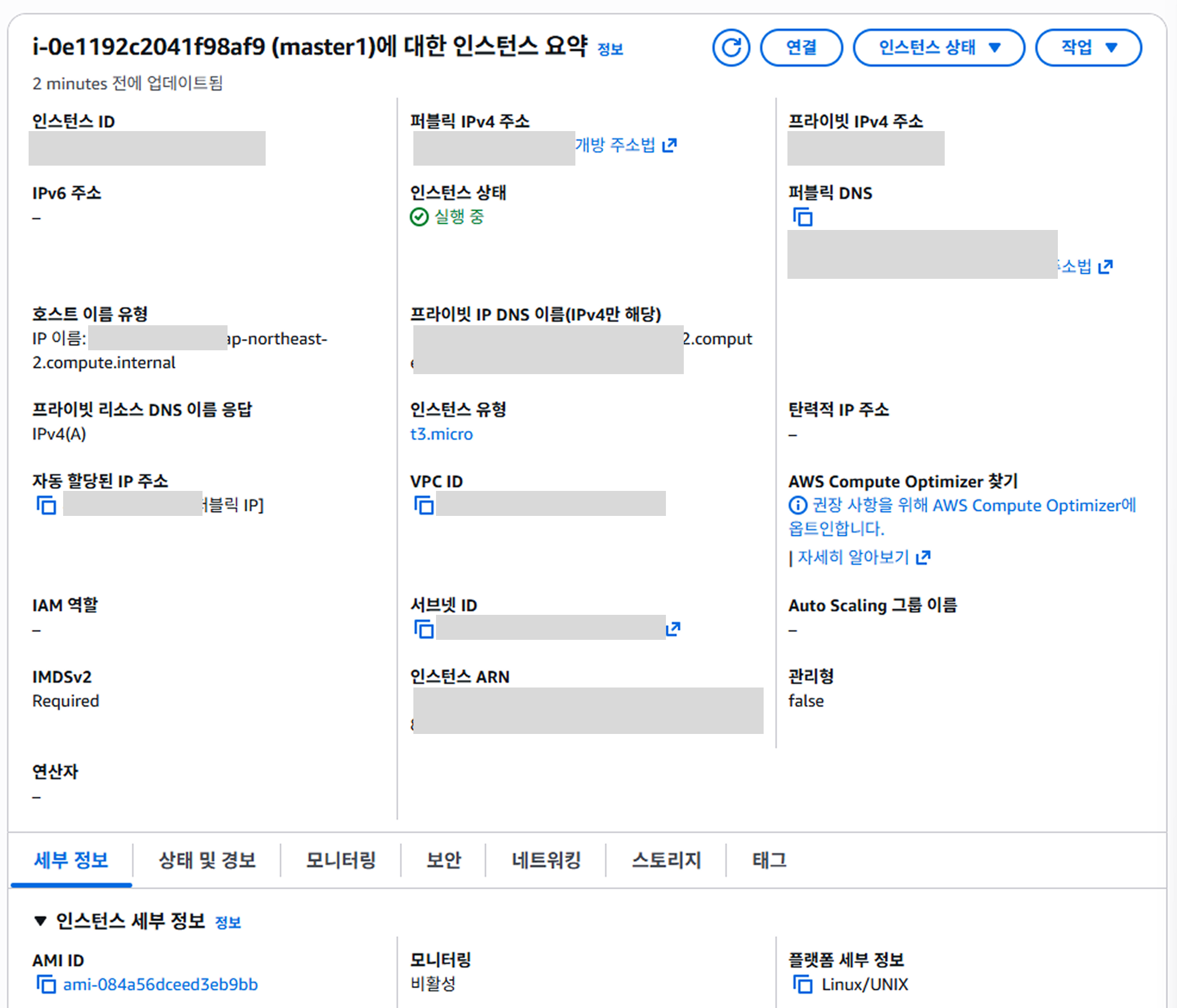 인스턴스 ID 파란 글씨를 누르면 인스턴스 요약에 들어갈 수 있습니다.