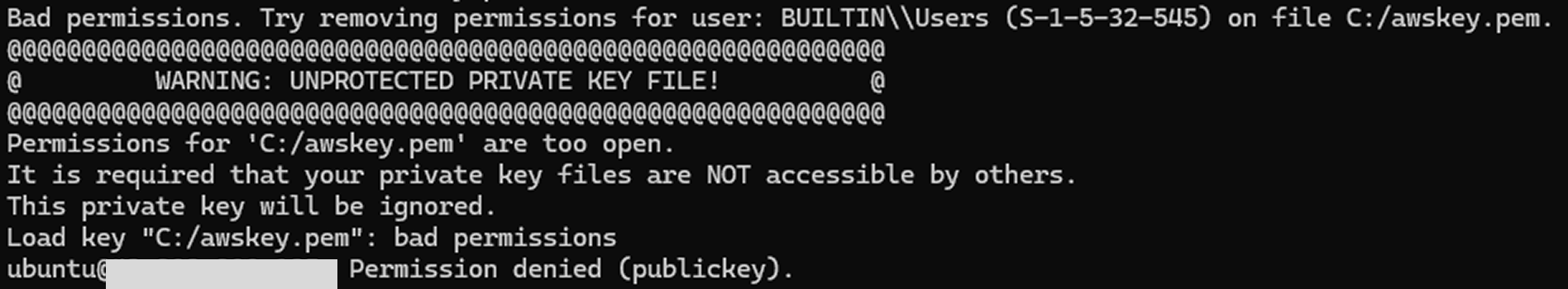 SSH는 이 키 파일을 다른 사람도 볼 수 있다고 판단해서 보안상 거부한다.