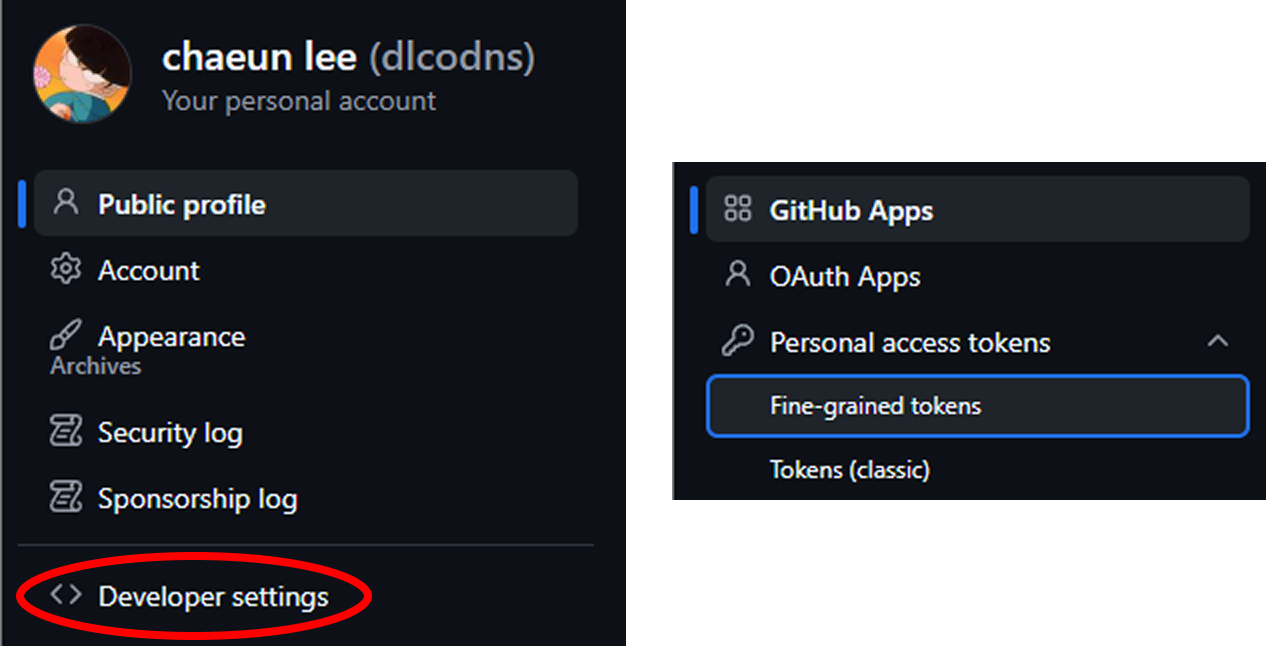 3. Personal access tokens의 Fine-grained tokens를 들어간다.