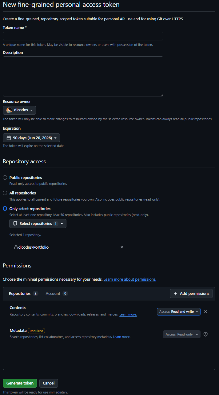 나는 portfolio 레포와 Contents permission의 Read and Write를 설정했다.