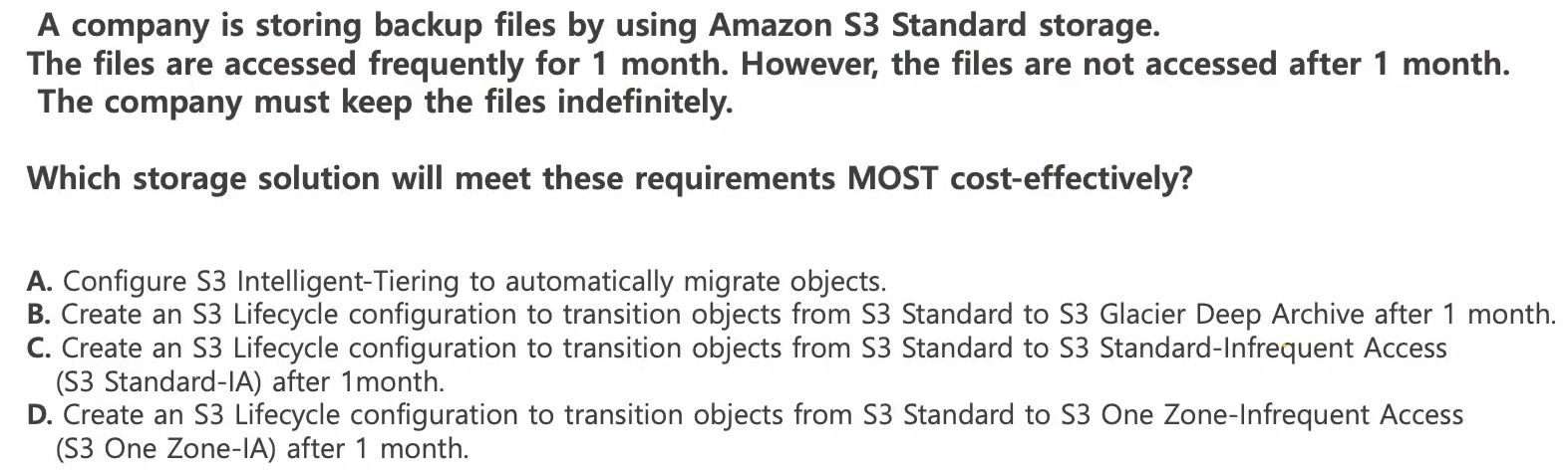 회사가 Amazon S3 Standard 스토리지를 사용해서 백업 파일을 저장하고 있다. 파일은 1개월 동안 자주 접근된다. 하지만 1개월 이후에는 접근하지 않는다. 회사는 파일을 무기한으로 보관해야 한다.