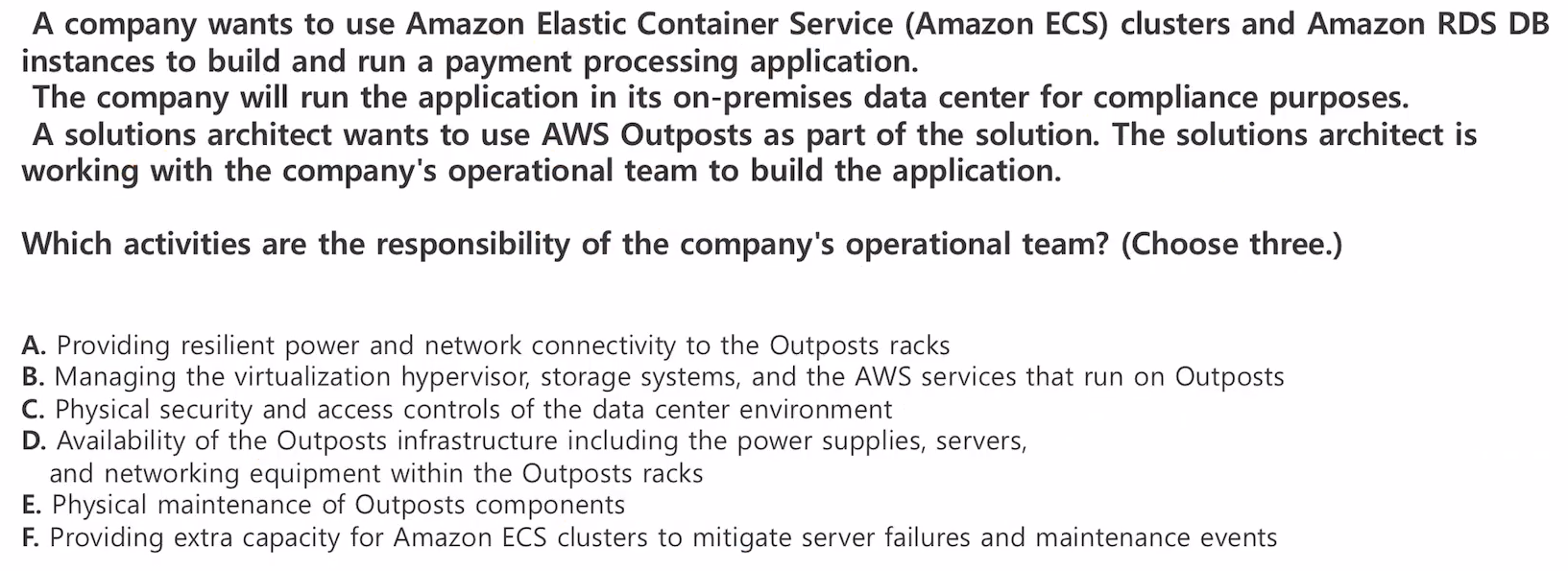 솔루션 아키텍트는 솔루션의 일부로 AWS Outposts를 사용하려 하고, 회사의 운영팀과 함께 애플리케이션을 구축하고 있다.
