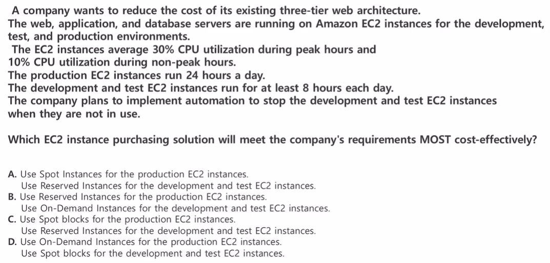 D. 운영 EC2에 On-Demand 인스턴스 사용. 개발, 테스트 EC2에 Spot 블록 사용.