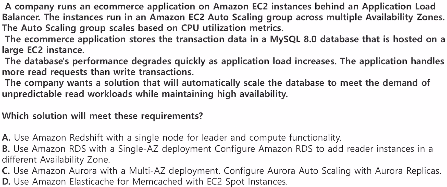 풀이: MySQL DB이기 때문에 RDS 아니면 Aurora다. A, D 제외.