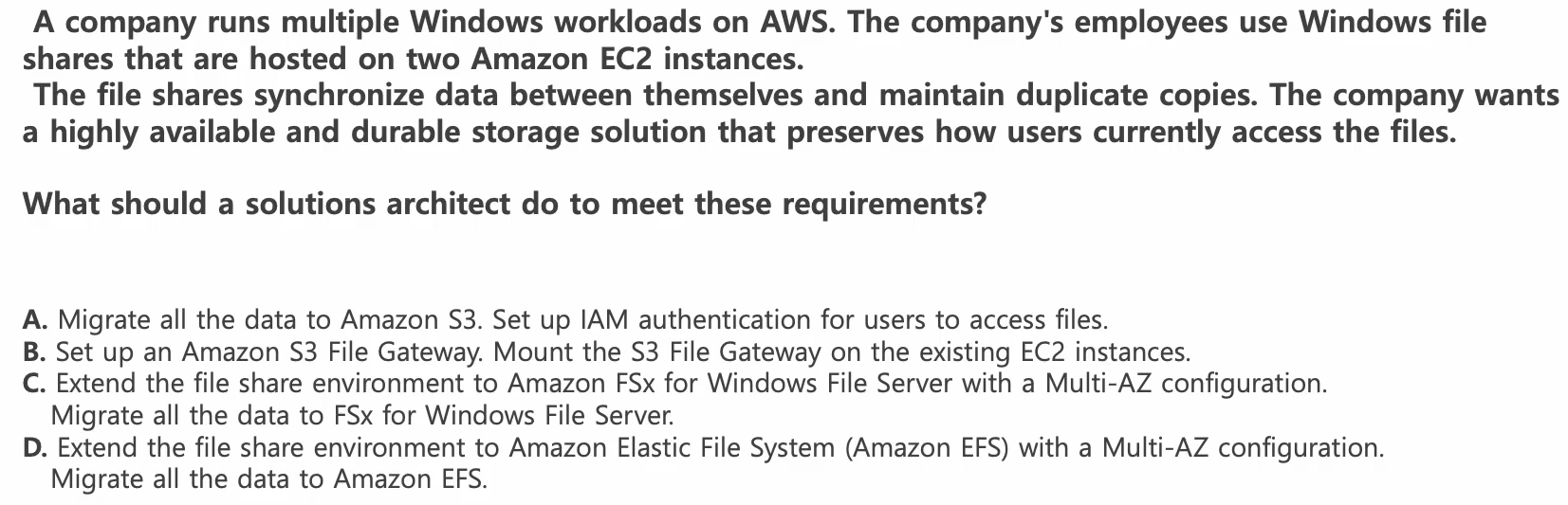 C. 파일 공유 환경을 Multi-AZ 구성의 FSx for Windows File Server로 확장한다. 모든 데이터를 FSx for Windows File Server로 마이그레이션한다.