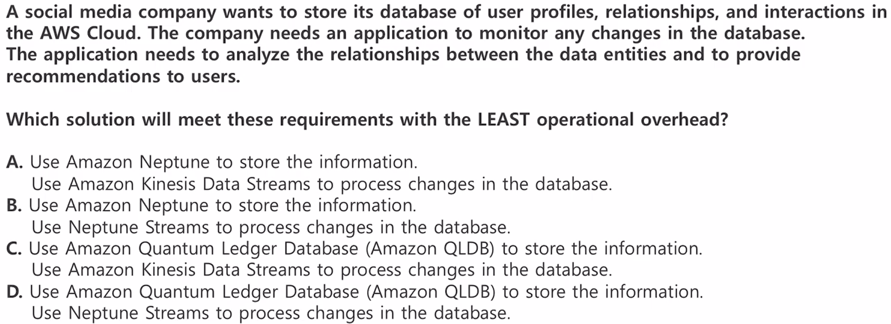 한 소셜 미디어 회사가 유저 프로필, 관계, 상호작용 데이터베이스를 AWS Cloud에 저장하려 합니다. DB의 변경사항을 모니터링하는 앱이 필요합니다. 앱은 데이터 엔터티 간의 관계를 분석하고 유저에게 추천을 제공해야 합니다.