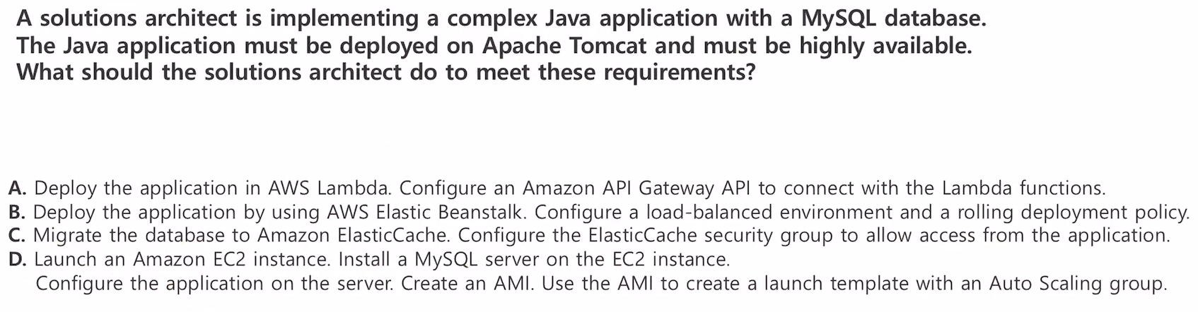 풀이: DB가 존재하고 Java와 Tomcat에 배포되어야 한다. Tomcat이 있다면 사용자 서버가 있는 것이기 때문에 A의 Lambda 서버리스는 제외, C의 ElastiCache는 DB가 아니라서 마이그레이션 할 수 없다. 제외.