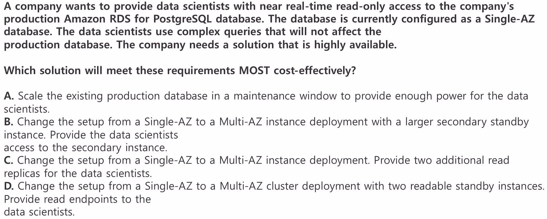 D. Single-AZ에서 읽기 가능한 Standby 인스턴스 2개를 가진 Multi-AZ Cluster 배포로 변경한다. 데이터 과학자들에게 읽기 엔드포인트를 제공한다.