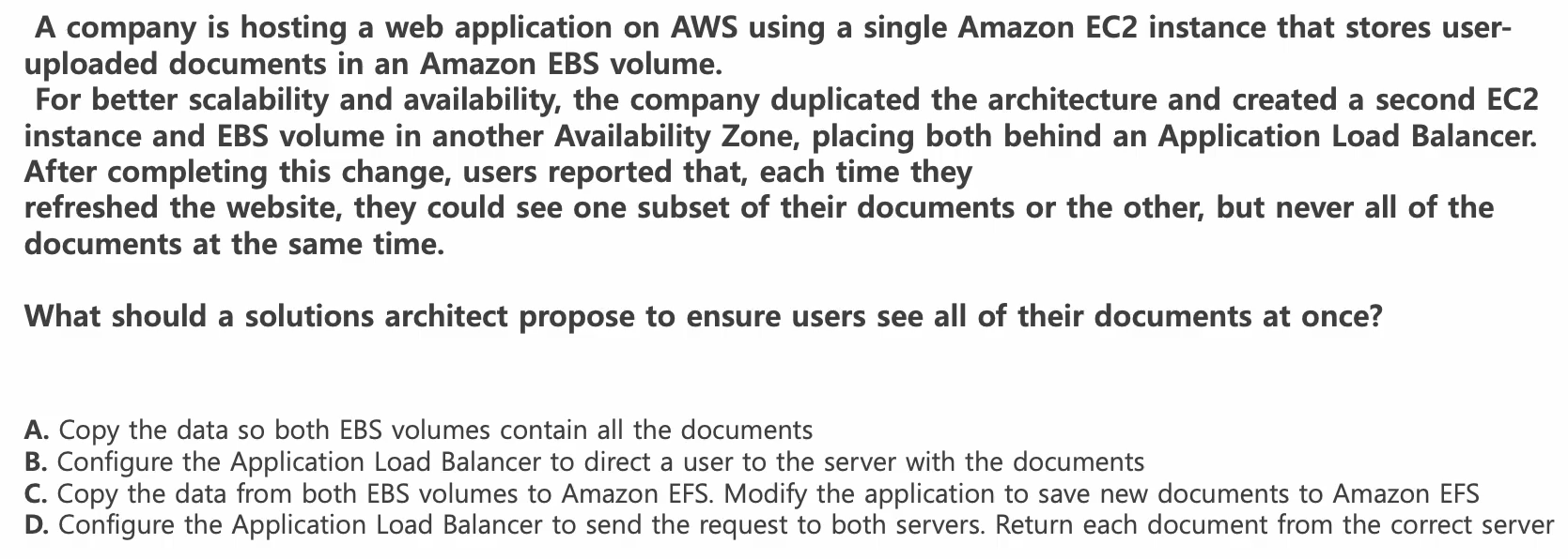 풀이: 현재 사용 중인 EBS는 EC2와 1대1 매칭이기 때문에 두 EBS 간의 데이터는 다르고, 각 EC2의 사용자들은 하나의 EBS 내용만 볼 수 있다. EFS로 마이그레이션 하면 공유 스토리지이기 때문에 각 EC2에서 같은 내용을 볼 수 있다.
